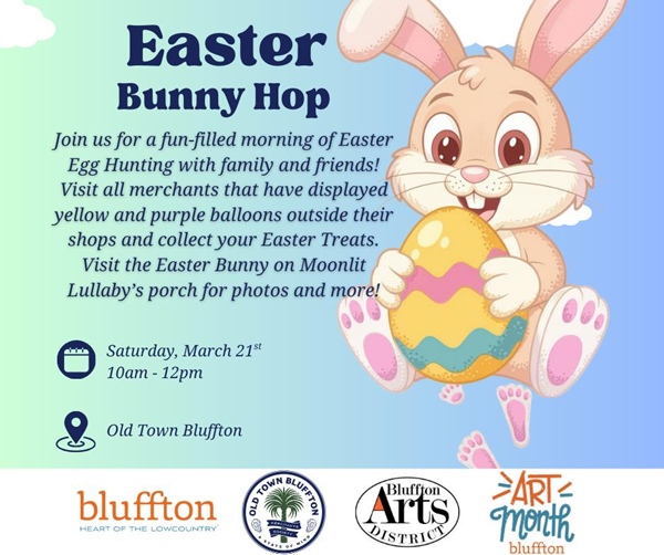 Easter Bunny Hop in Old Town Bluffton Share on Facebook (Opens in new window) Facebook Share on X (Opens in new window) X Share on Bluesky (Opens in new window) Bluesky Share on Reddit (Opens in new window) Reddit When Mar 21st, 2026 10:00am - 12:00pm Where Bridge StBlufftonSC29910 Share on Facebook (Opens in new window) Facebook Share on X (Opens in new window) X Share on Bluesky (Opens in new window) Bluesky Share on Reddit (Opens in new window) Reddit